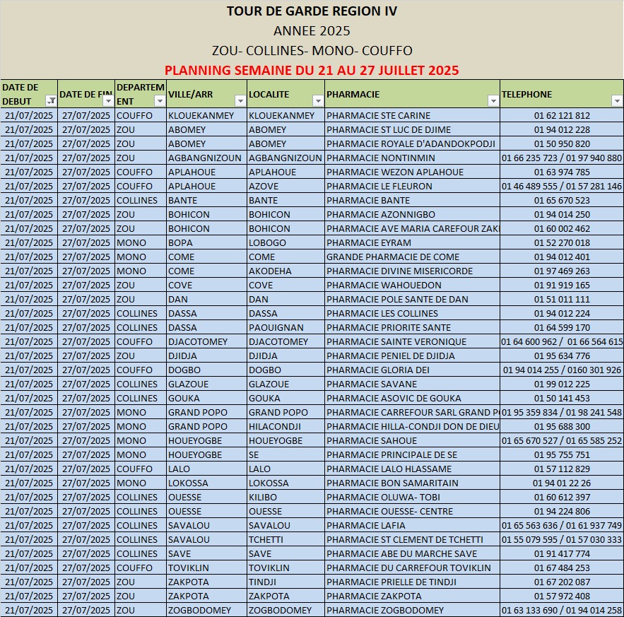 PROGRAMME DE GARDE (ZOU/COLLINES/MONO/COUFFO) DU 21 AU 27 JUILLET