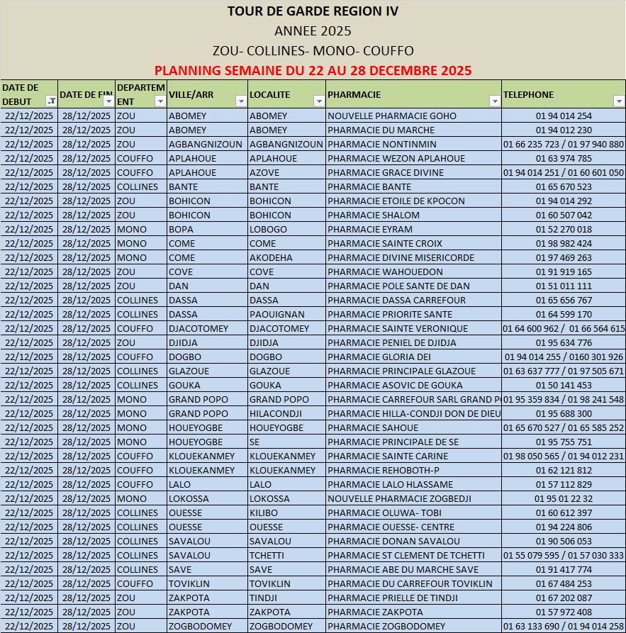 PROGRAMME DE GARDE (ZOU/COLLINES/MONO/COUFFO) DU 22 AU 28 DECEMBRE 2025