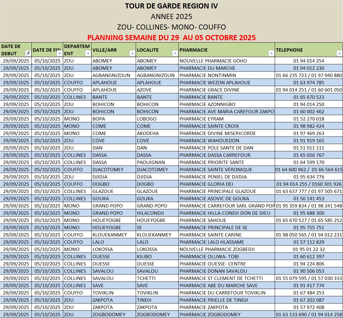 PROGRAMME DE GARDE (ZOU/COLLINES/MONO/COUFFO) DU 29 AU 05 OCTOBRE 2025