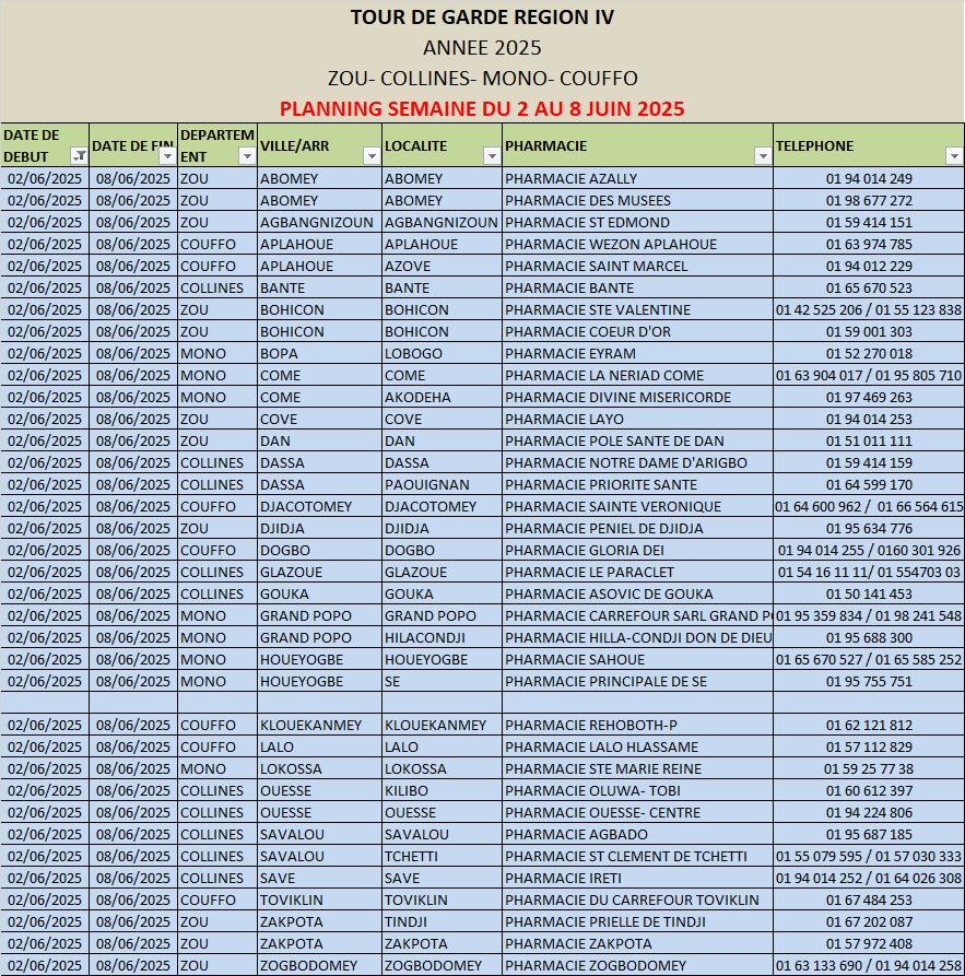 PROGRAMME DE GARDE (ZOU/COLLINES/MONO/COUFFO) DU DU 02 AU 08 JUIN